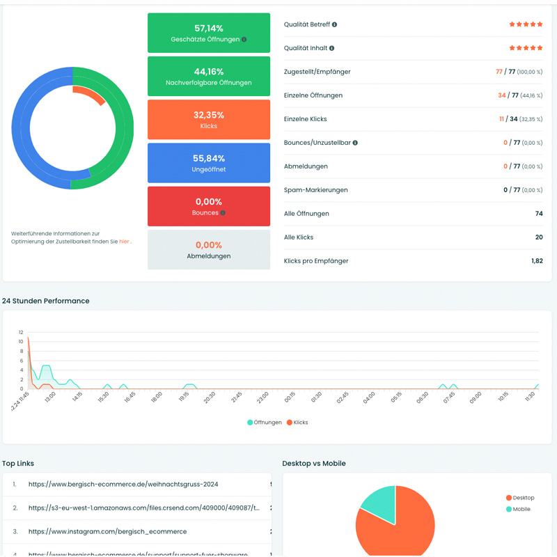 Über umfangreiche Auswertungen, stehen die wichtigsten Kennzahlen, wie z.B. Öffnungsrate, Zustellungsrate, Klicks, Abmeldungen oder Bounces zur Verfügung.