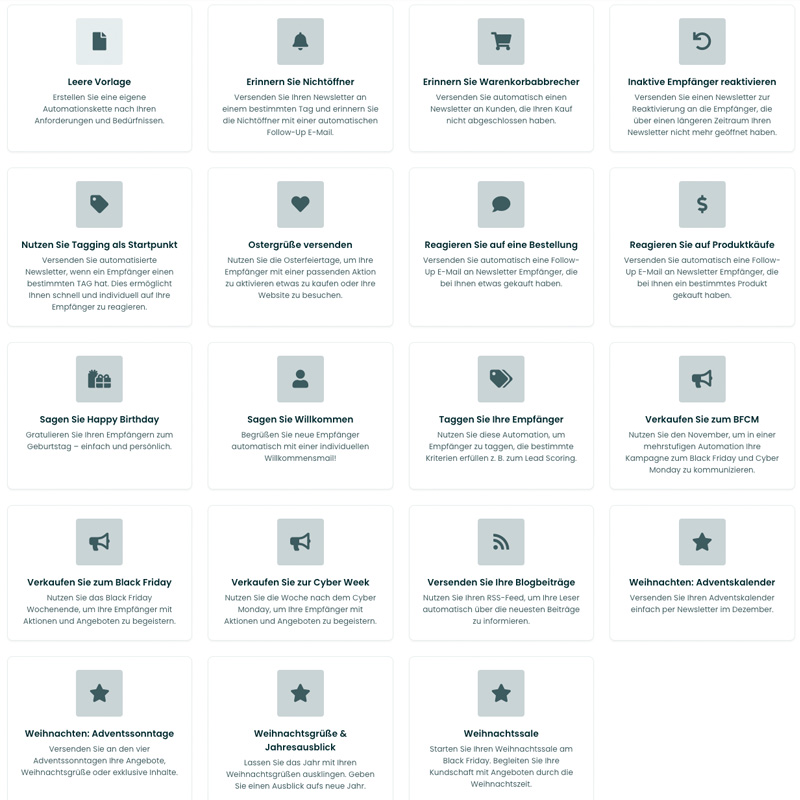 CleverReach ermöglicht die Automatisierung von E-Mail-Marketing mit leistungsstarken Workflows. Durch individuelle Trigger, Segmentierung und personalisierte Inhalte werden Kampagnen effizient gesteuert. So kannst du z.B. folgende Automatisierungen einrichten: Erinnern Sie Nichtöffner, Inaktive Empfänger reaktivieren, Sagen Sie Happy Birthday, Weihnachten: Adventskalender