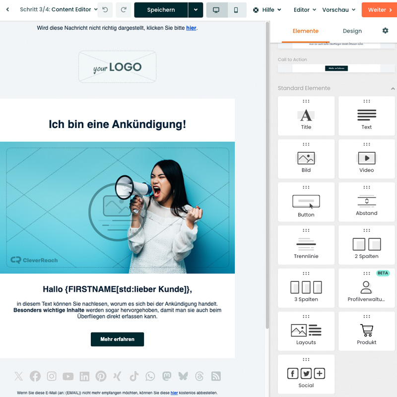 Newsletter können mit wenigen Handgriffen erstellt werden. Entweder auf Basis einer fertigen Vorlagen oder aber durch Drag & Drop von fertigen Elemente. Wähle aus: Produkt, Bild, Video, Text, Spalten uvm.