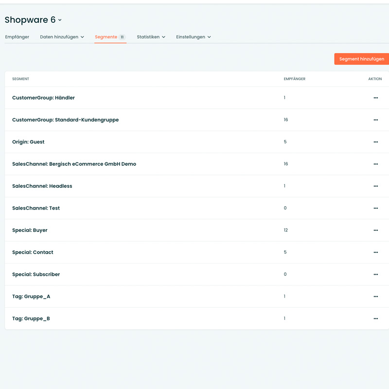 Empfänger können anhand unterschiedlichen Kriterien klassifiziert werden. Die Synchronisierung zwischen Shopware und CleverReach läuft automatisch. Im Standard wird zwischen Shopkunden, Newsletter-Abonnenten und weiteren Kontaktadressen unterschieden.